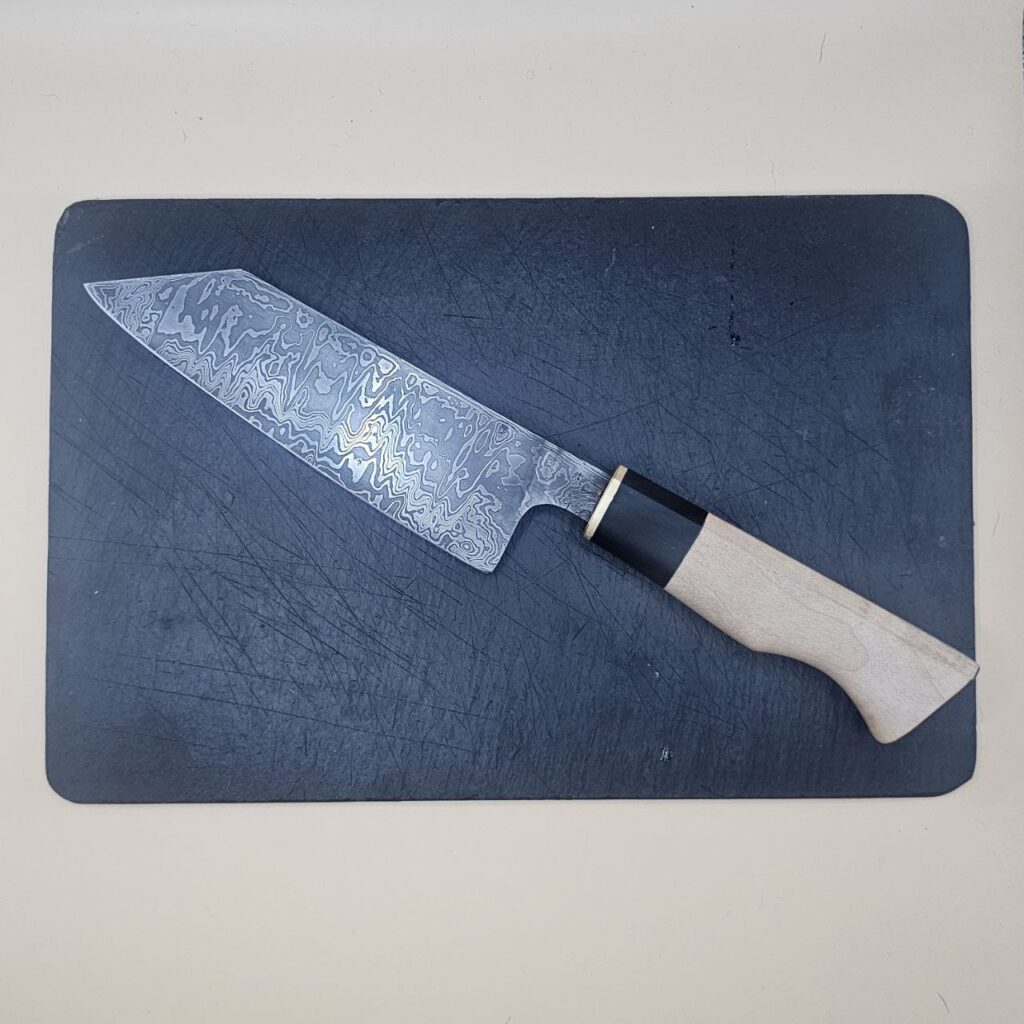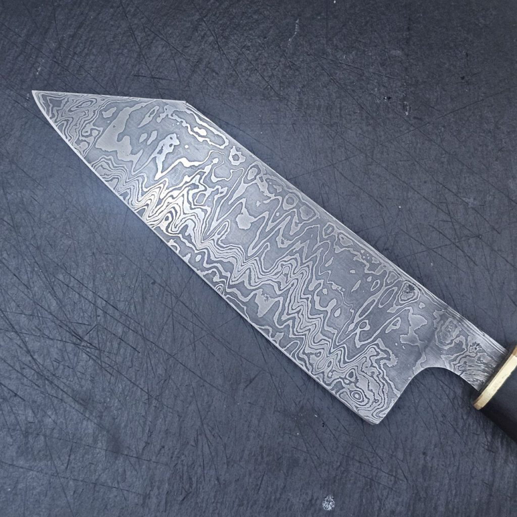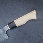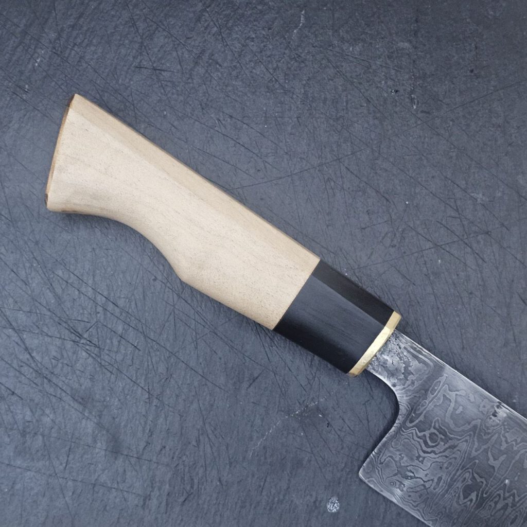 This Bunka knife is forged from 48 layers of damascus steel, made from 15N20 and recycled saw blades. The result is a tough, fine-grained blade with a balanced mix of edge stability and resilience. Heat treated to approximately 59–60 HRC, the blade offers reliable sharpness for everyday kitchen work.