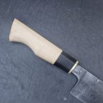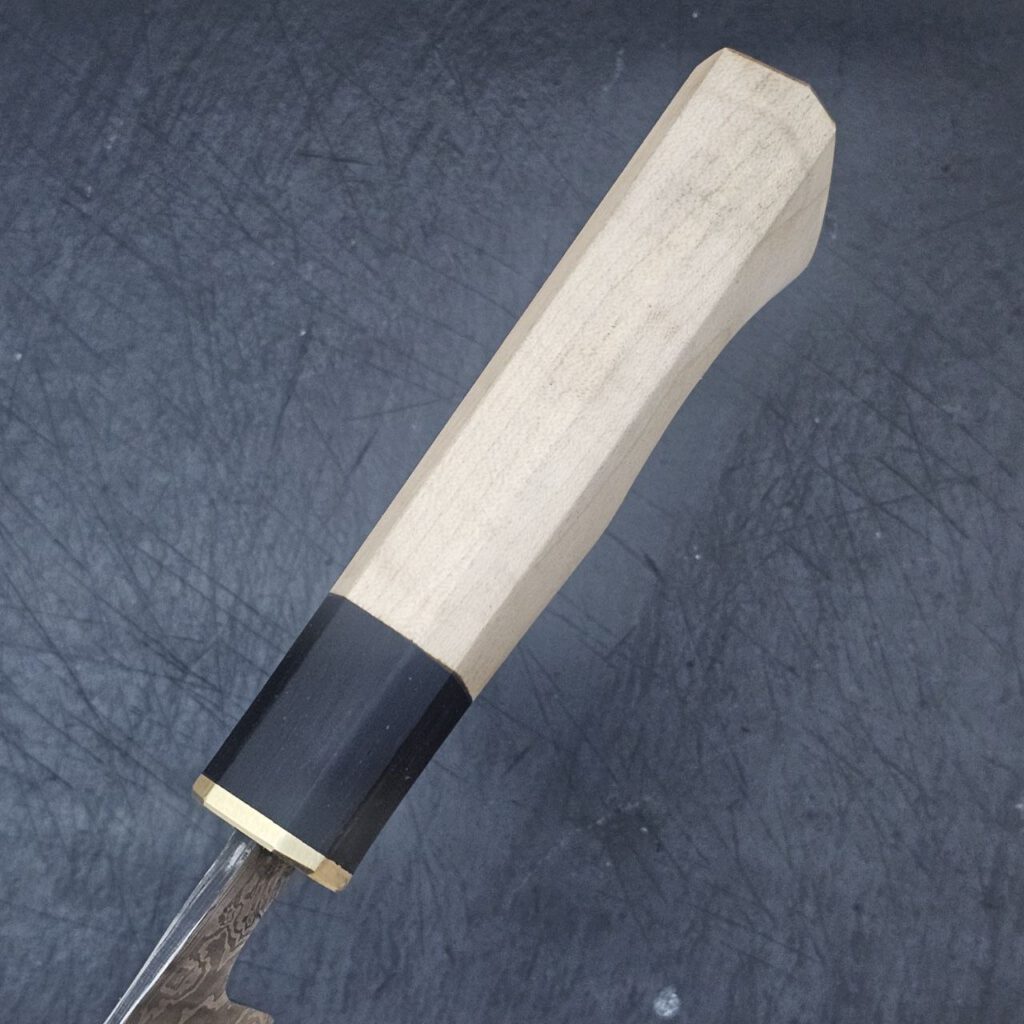 With a blade length of 16 cm plus a 2 cm ricasso, a width of 4.5 cm, and a thickness of 3 mm, this Bunka is thinner than many traditional examples. The blade is ground close to zero for efficient cutting and finished with a hand-sanded surface.