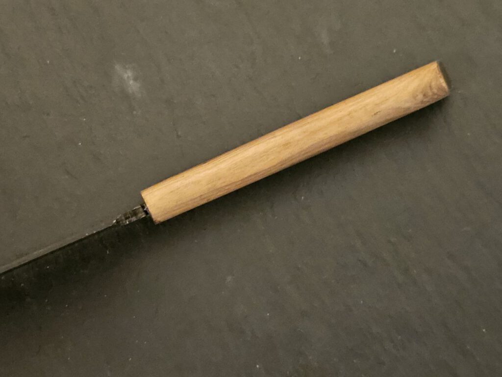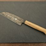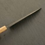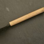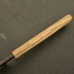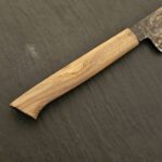 The handle is shaped from slender, naturally patterned olive wood. Its narrow 11 cm profile provides a light, nimble feel that pairs perfectly with the Bunka’s compact geometry, making the knife an agile companion for chopping, slicing, and daily prep work.