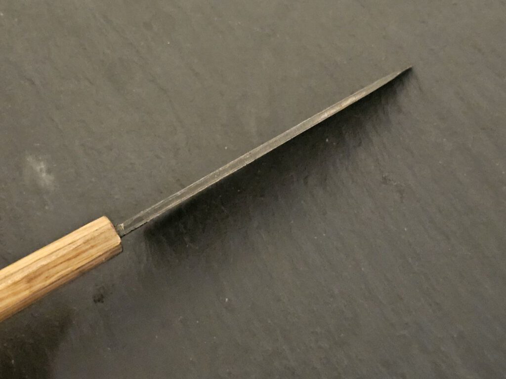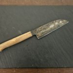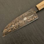 Measuring 3 mm at the spine and 3 cm in width, the blade is ground with a double-bevel profile suited for versatile kitchen tasks. A pair of shallow fullers is carved symmetrically into both sides of the blade, helping reduce sticking and allowing vegetables to fall away cleanly during slicing.