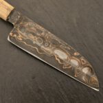 This handcrafted Bunka knife brings striking copper-damascus aesthetics together with compact, everyday kitchen performance. The blade features a K720 core wrapped in a layered cladding of eight copper sheets and nine steel layers, creating a warm, contrasting pattern unique to each forging. With its 11 cm cutting edge and an additional 1 cm ricasso, the blade offers precise control for both push-cuts and fine detail work.