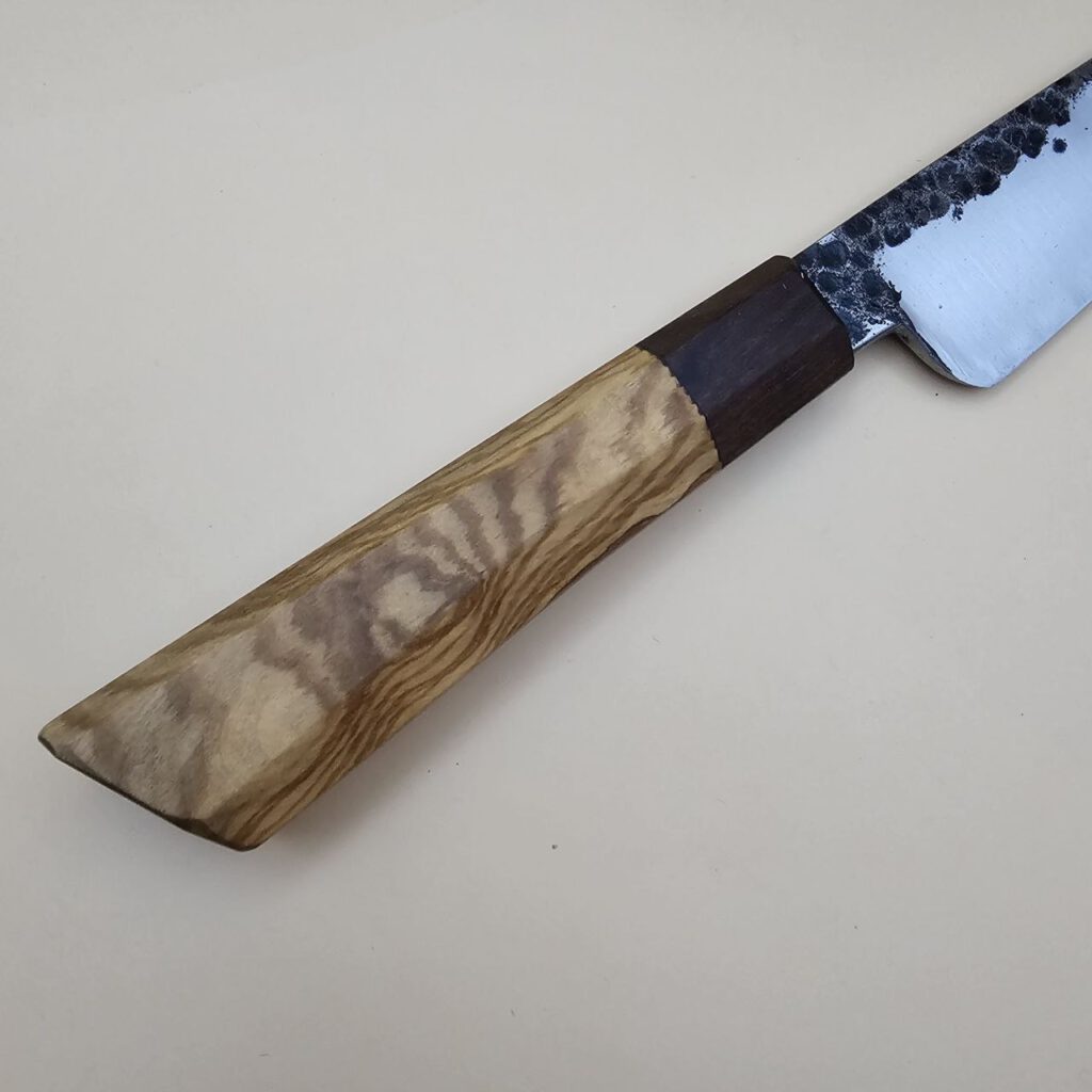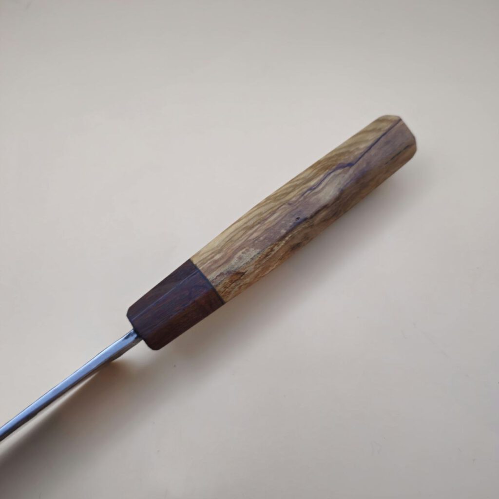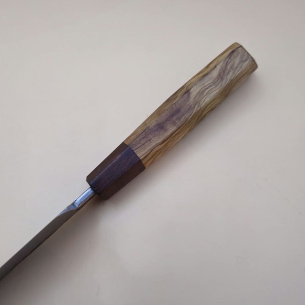 The handle is crafted from steamed acacia and olive wood, providing a balanced grip and a natural, comfortable feel during extended use.