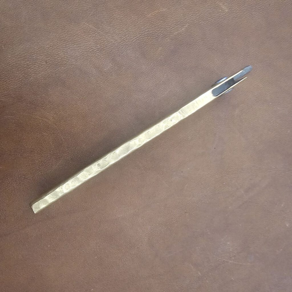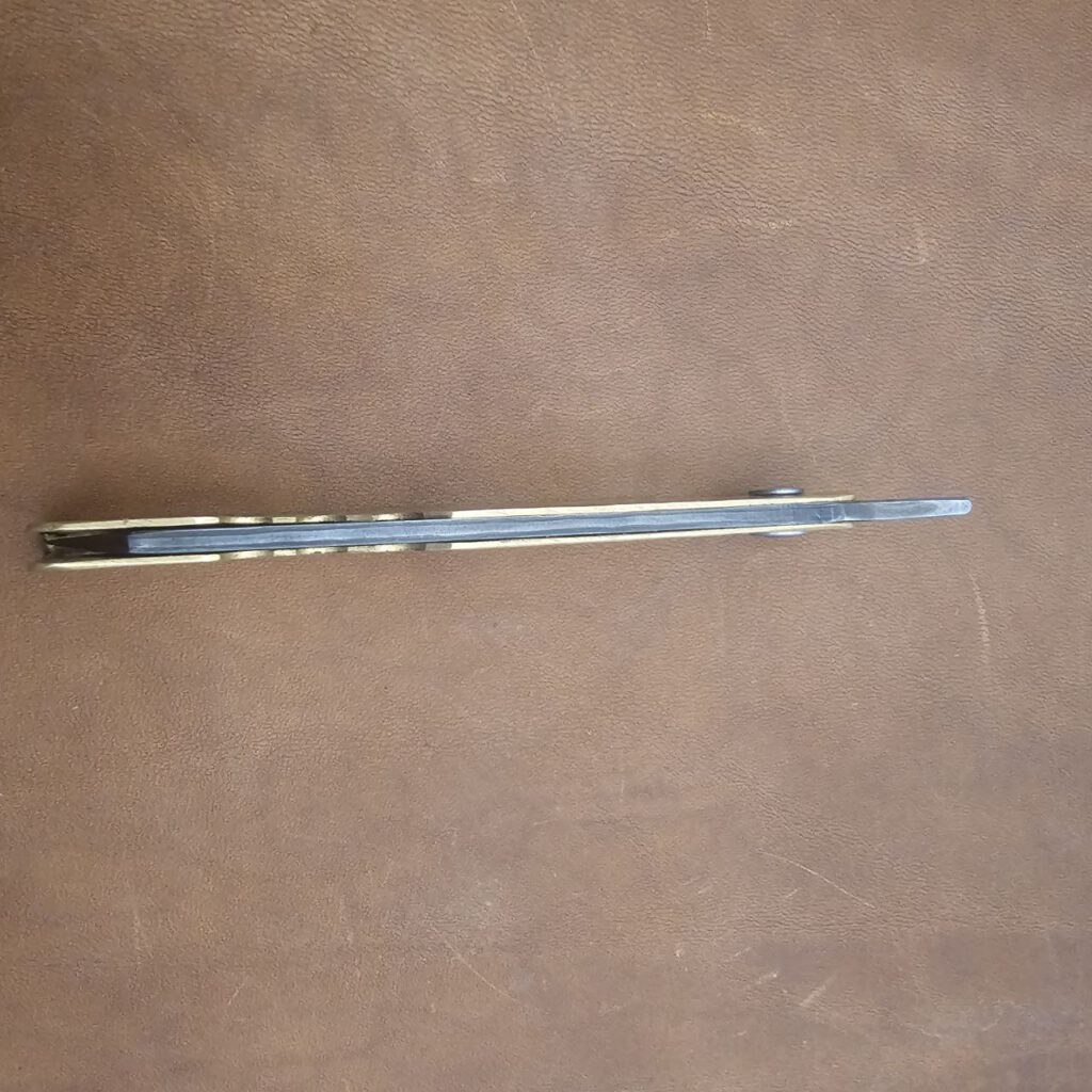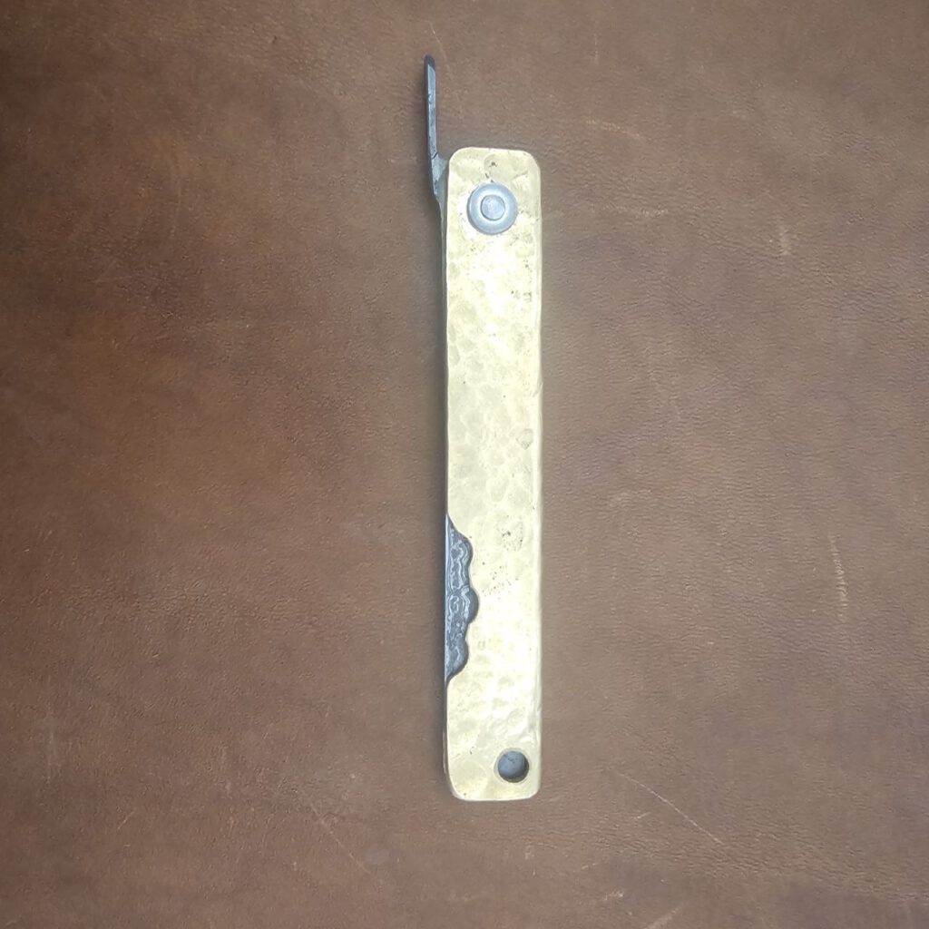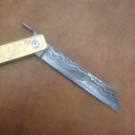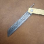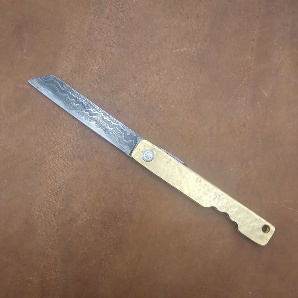 This Higonokami is forged in a san-mai construction with a mid-layer damascus cladding. The core is 15N20 steel, providing reliable toughness and consistent cutting performance. The damascus outer layers add visual structure and support the core with additional stability.